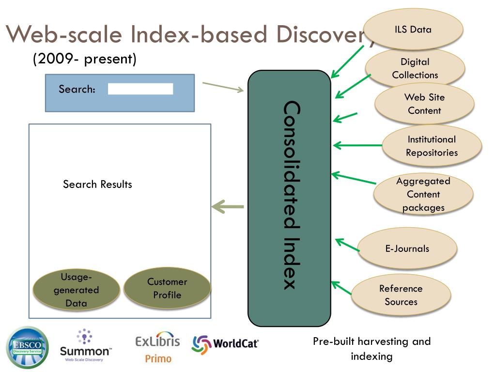 Web-scale Index-based Discovery ILS Data (2009- present) Digital Collections Search: Web Site Content Institutional Repositories Aggregated Content packages Search Results Consolidated Index … E-Journals CustomerProfile Usage-generatedData Reference Sources Pre-built harvesting and indexing