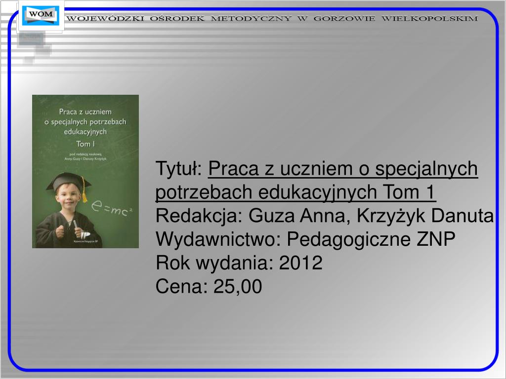 Tytuł: Praca z uczniem o specjalnych potrzebach edukacyjnych Tom 1Redakcja: Guza Anna, Krzyżyk DanutaWydawnictwo: Pedagogiczne ZNPRok wydania: 2012Cena: 25,00