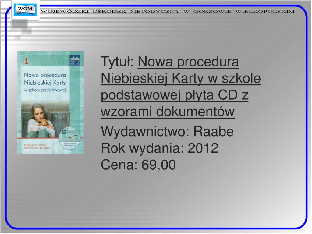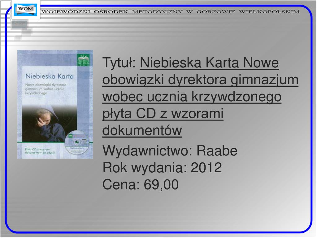 Tytuł: Niebieska Karta Nowe obowiązki dyrektora gimnazjum wobec ucznia krzywdzonegopłyta CD z wzorami dokumentów Wydawnictwo: RaabeRok wydania: 2012Cena: 69,00