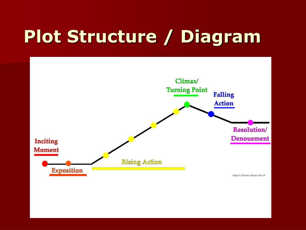 Plot Components Climax: the turning point, the most intense moment—either mentally or in action Rising Action: the series of conflicts and crisis in the story that lead to the climax Falling Action: all of the action which follows the climax Initiating Incident: the first moment of conflict Resolution: the conclusion, the tying together of all of the threads, or, the cliffhanger Introduction and Exposition: the start of the story (characters/setting), the situation/background before the action starts