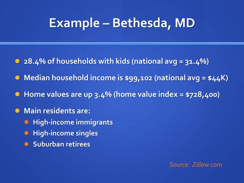 Example – Bethesda, MD • 28.4% of households with kids (national avg = 31.4%) • Median household income is $99,102 (national avg = $44K) • Home values are up 3.4% (home value index = $728,400) • Main residents are: • High-income immigrants • High-income singles • Suburban retirees Source: Zillow.com