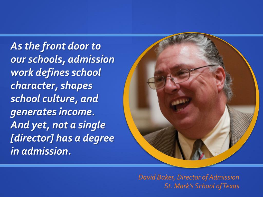 As the front door to our schools, admission work defines school character, shapes school culture, and generates income. And yet, not a single [director] has a degree in admission. David Baker, Director of Admission St. Mark’s School of Texas