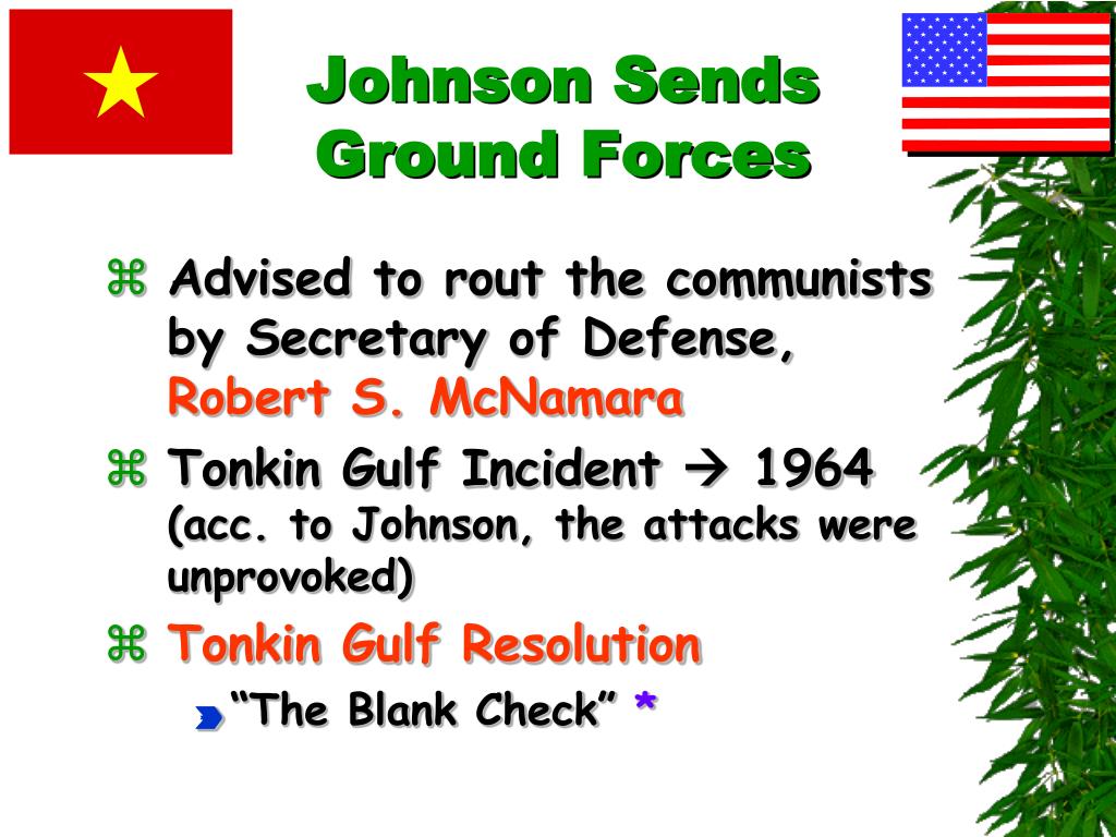 Johnson Sends Ground Forces • Advised to rout the communists by Secretary of Defense, Robert S. McNamara • Tonkin Gulf Incident 1964(acc. to Johnson, the attacks were unprovoked) • Tonkin Gulf Resolution • “The Blank Check” *