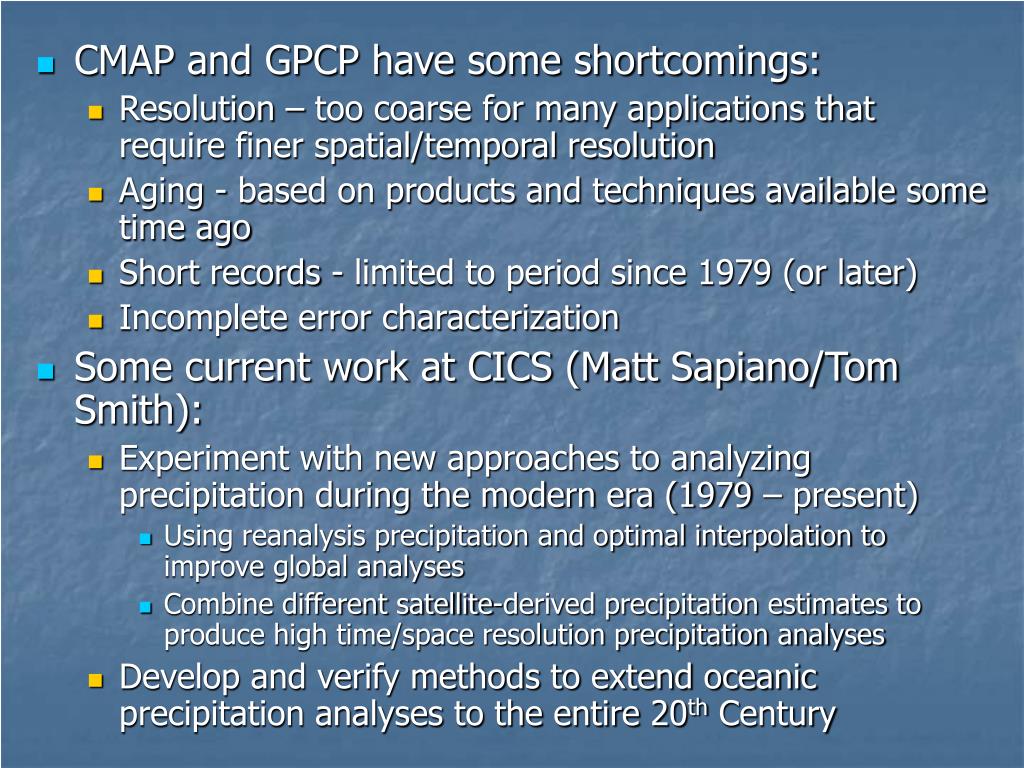 CMAP and GPCP have some shortcomings: • Resolution – too coarse for many applications that require finer spatial/temporal resolution • Aging - based on products and techniques available some time ago • Short records - limited to period since 1979 (or later) • Incomplete error characterization • Some current work at CICS (Matt Sapiano/Tom Smith): • Experiment with new approaches to analyzing precipitation during the modern era (1979 – present) • Using reanalysis precipitation and optimal interpolation to improve global analyses • Combine different satellite-derived precipitation estimates to produce high time/space resolution precipitation analyses • Develop and verify methods to extend oceanic precipitation analyses to the entire 20th Century