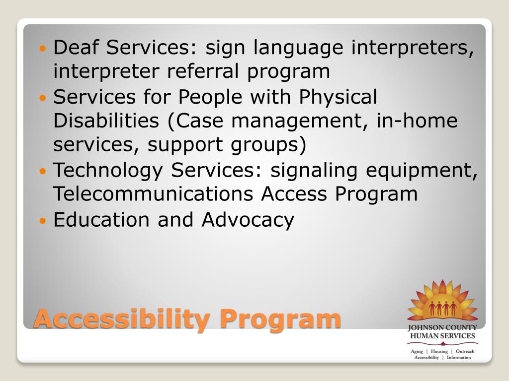 Deaf Services: sign language interpreters, interpreter referral program • Services for People with Physical Disabilities (Case management, in-home services, support groups) • Technology Services: signaling equipment, Telecommunications Access Program • Education and Advocacy Accessibility Program