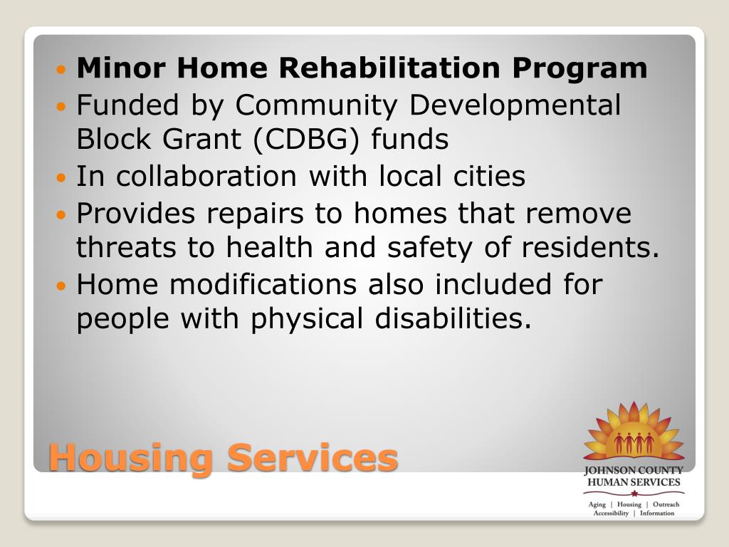 Minor Home Rehabilitation Program • Funded by Community Developmental Block Grant (CDBG) funds • In collaboration with local cities • Provides repairs to homes that remove threats to health and safety of residents. • Home modifications also included for people with physical disabilities. Housing Services