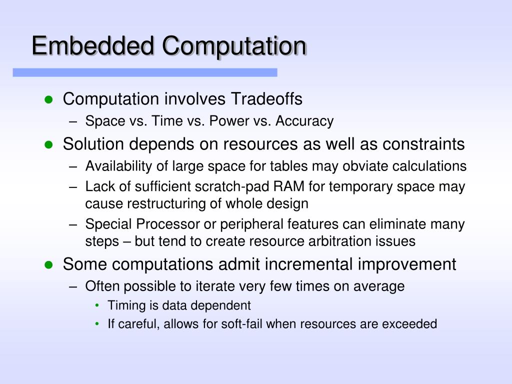 Embedded Computation • Computation involves Tradeoffs • Space vs. Time vs. Power vs. Accuracy • Solution depends on resources as well as constraints • Availability of large space for tables may obviate calculations • Lack of sufficient scratch-pad RAM for temporary space may cause restructuring of whole design • Special Processor or peripheral features can eliminate many steps – but tend to create resource arbitration issues • Some computations admit incremental improvement • Often possible to iterate very few times on average • Timing is data dependent • If careful, allows for soft-fail when resources are exceeded