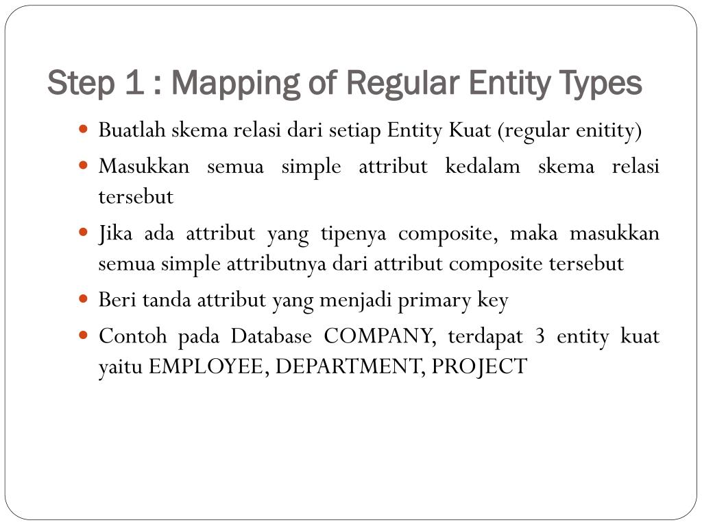 Step 1 : Mapping of Regular Entity Types • Buatlah skema relasi dari setiap Entity Kuat (regular enitity) • Masukkan semua simple attribut kedalam skema relasi tersebut • Jika ada attribut yang tipenya composite, maka masukkan semua simple attributnya dari attribut composite tersebut • Beri tanda attribut yang menjadi primary key • Contoh pada Database COMPANY, terdapat 3 entity kuat yaitu EMPLOYEE, DEPARTMENT, PROJECT