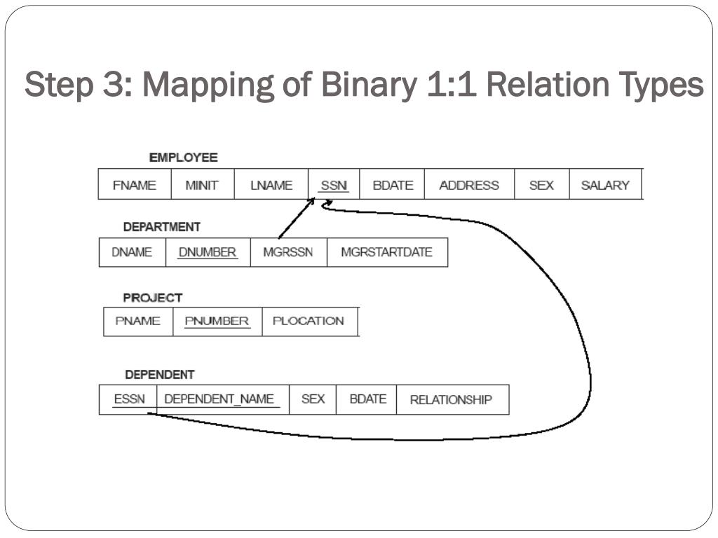 Step 3: Mapping of Binary 1:1 Relation Types • Jika ada dua buah entity misalnya enitity S dan T berelasi dengan rasio kardinalitas 1:1, maka ada 2 kemungkinan: 1. Pendekatan Foreign Key : masukkan primary key entity yang jenis relasinya parsial sekaligus simple attribut didalam relasinya kedalam entity yang jenis relasinya total. 2. Menggabungkan menjadi satu skema relasi jika tipe relasinya sama-sama total. Dengan memasukkan semua simple attribut baik didalam entity maupun relasi. • Contoh untuk relasi 1:1 adalah EMPLOYEE menjadi Manager dari DEPARTMENT