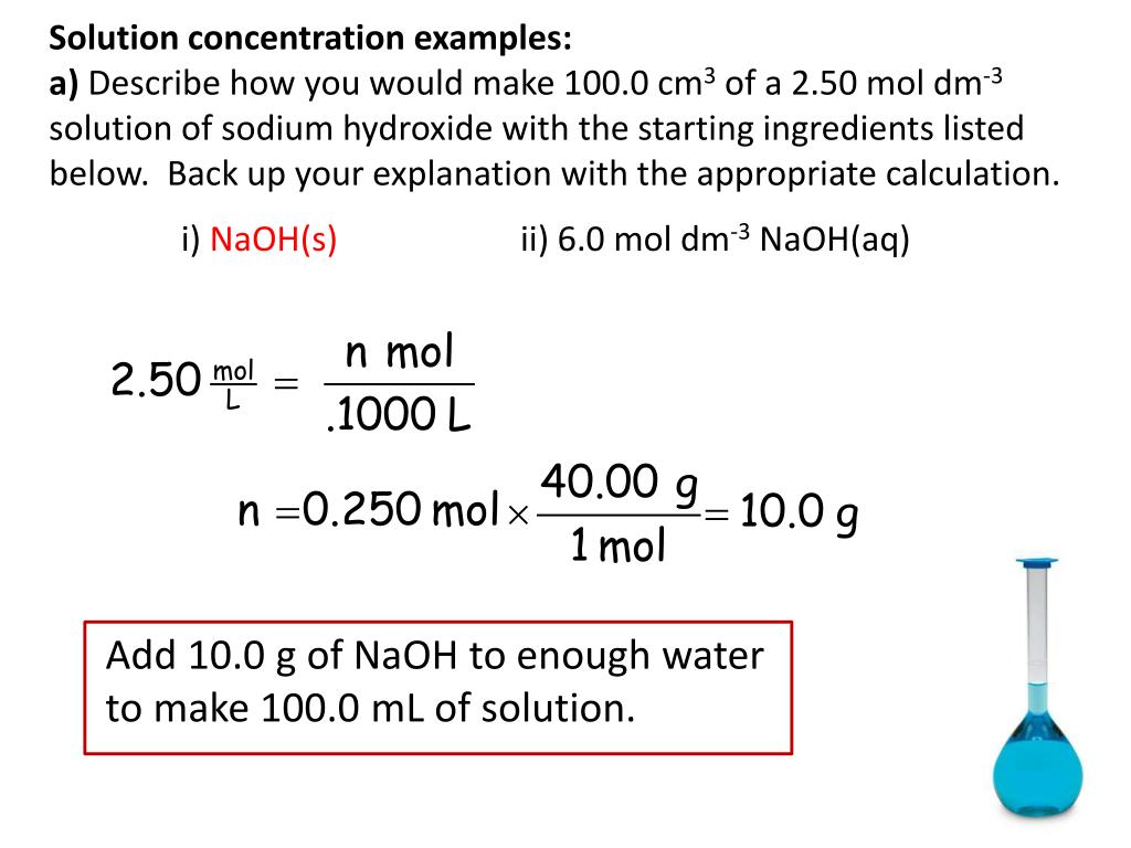 Solution concentration examples:a) Describe how you would make 100.0 cm3 of a 2.50 mol dm-3 solution of sodium hydroxide with the starting ingredients listed below. Back up your explanation with the appropriate calculation. i)NaOH(s) ii) 6.0 mol dm-3NaOH(aq) Add 10.0 g of NaOH to enough water to make 100.0 mL of solution.