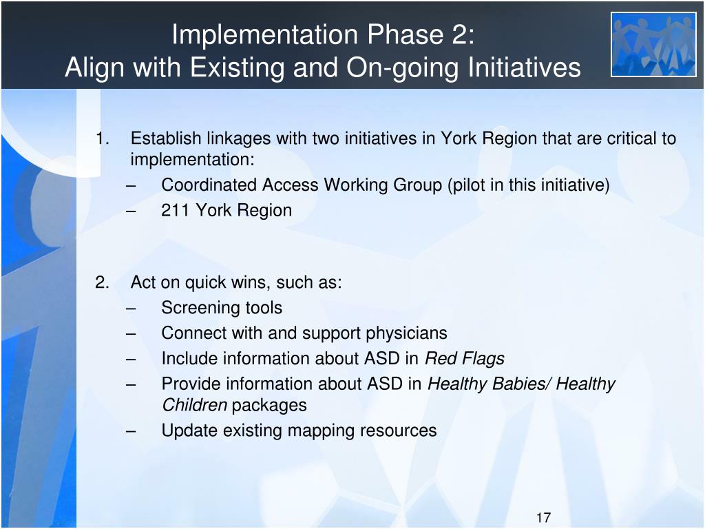 Implementation Phase 2:Align with Existing and On-going Initiatives • Establish linkages with two initiatives in York Region that are critical to implementation: • Coordinated Access Working Group (pilot in this initiative) • 211 York Region • Act on quick wins, such as: • Screening tools • Connect with and support physicians • Include information about ASD in Red Flags • Provide information about ASD in Healthy Babies/ Healthy Children packages • Update existing mapping resources