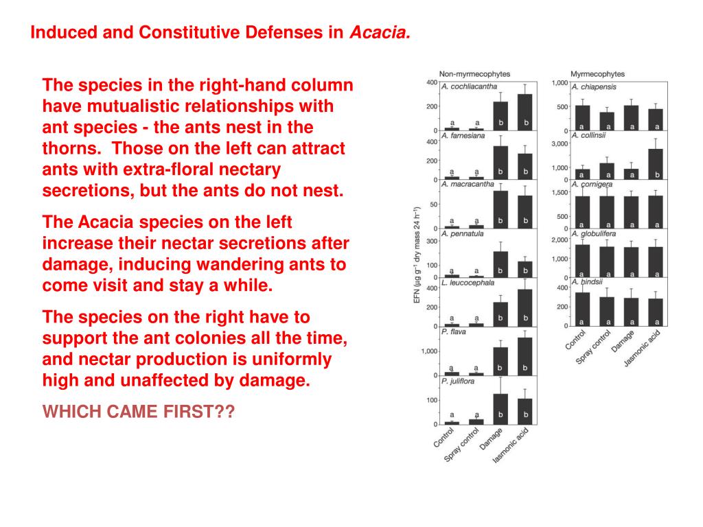 Induced and Constitutive Defenses in Acacia. The species in the right-hand column have mutualistic relationships with ant species - the ants nest in the thorns. Those on the left can attract ants with extra-floral nectary secretions, but the ants do not nest. The Acacia species on the left increase their nectar secretions after damage, inducing wandering ants to come visit and stay a while. The species on the right have to support the ant colonies all the time, and nectar production is uniformly high and unaffected by damage. WHICH CAME FIRST??