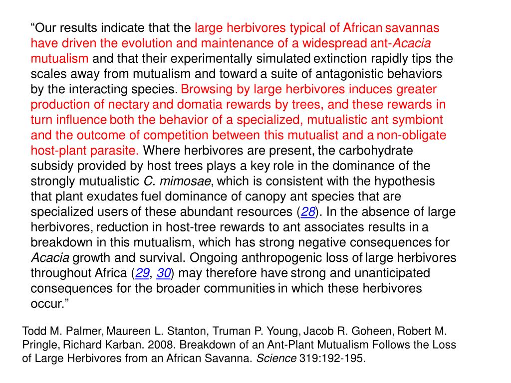 “Our results indicate that the large herbivores typical of Africansavannas have driven the evolution and maintenance of a widespreadant-Acacia mutualism and that their experimentally simulatedextinction rapidly tips the scales away from mutualism and towarda suite of antagonistic behaviors by the interacting species.Browsing by large herbivores induces greater production of nectaryand domatia rewards by trees, and these rewards in turn influenceboth the behavior of a specialized, mutualistic ant symbiontand the outcome of competition between this mutualist and anon-obligate host-plant parasite. Where herbivores are present,the carbohydrate subsidy provided by host trees plays a keyrole in the dominance of the strongly mutualistic C. mimosae,which is consistent with the hypothesis that plant exudatesfuel dominance of canopy ant species that are specialized usersof these abundant resources (28). In the absence of large herbivores,reduction in host-tree rewards to ant associates results ina breakdown in this mutualism, which has strong negative consequencesfor Acacia growth and survival. Ongoing anthropogenic loss oflarge herbivores throughout Africa (29, 30) may therefore havestrong and unanticipated consequences for the broader communitiesin which these herbivores occur.” Todd M. Palmer,Maureen L. Stanton, Truman P. Young,Jacob R. Goheen,Robert M. Pringle,Richard Karban. 2008. Breakdown of an Ant-Plant Mutualism Follows the Loss of Large Herbivores from an African Savanna. Science 319:192-195.