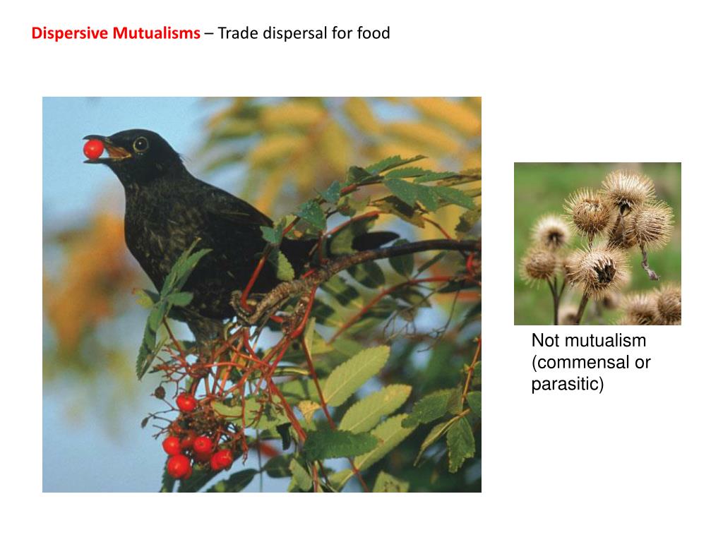 Dispersive Mutualisms – Trade dispersal for food Not mutualism (commensal or parasitic)
