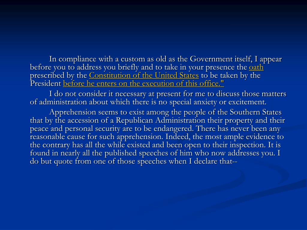 In compliance with a custom as old as the Government itself, I appear before you to address you briefly and to take in your presence the oath prescribed by the Constitution of the United States to be taken by the President before he enters on the execution of this office." I do not consider it necessary at present for me to discuss those matters of administration about which there is no special anxiety or excitement. Apprehension seems to exist among the people of the Southern States that by the accession of a Republican Administration their property and their peace and personal security are to be endangered. There has never been any reasonable cause for such apprehension. Indeed, the most ample evidence to the contrary has all the while existed and been open to their inspection. It is found in nearly all the published speeches of him who now addresses you. I do but quote from one of those speeches when I declare that--