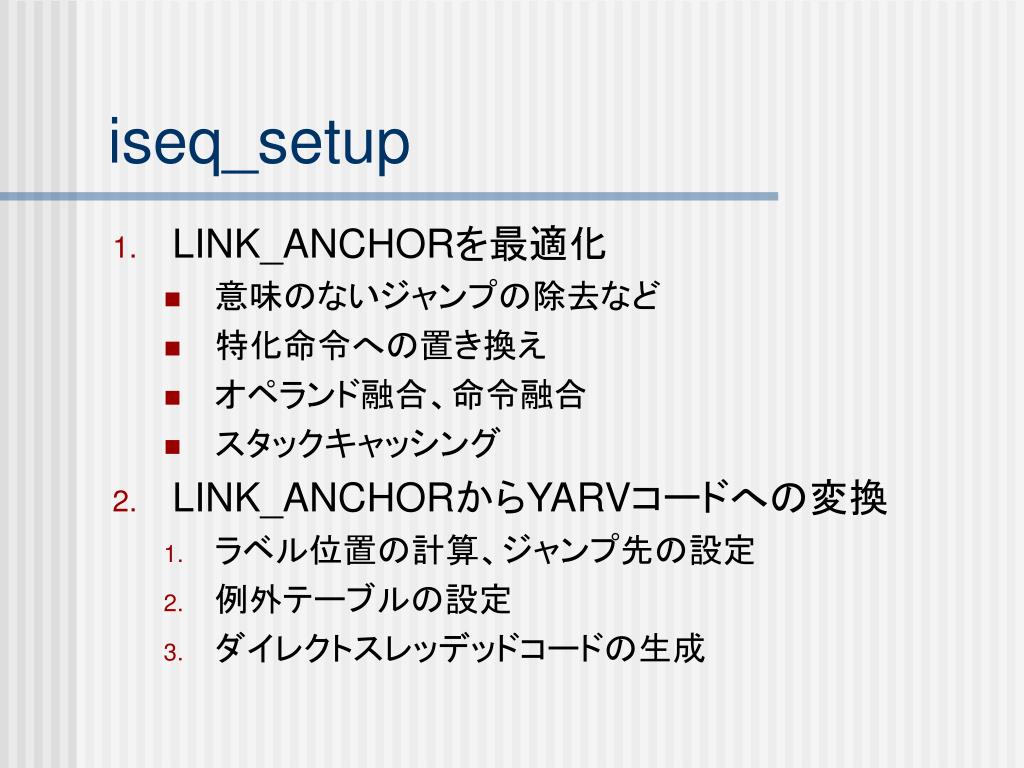 iseq_setup • LINK_ANCHORを最適化 • 意味のないジャンプの除去など • 特化命令への置き換え • オペランド融合、命令融合 • スタックキャッシング • LINK_ANCHORからYARVコードへの変換 • ラベル位置の計算、ジャンプ先の設定 • 例外テーブルの設定 • ダイレクトスレッデッドコードの生成