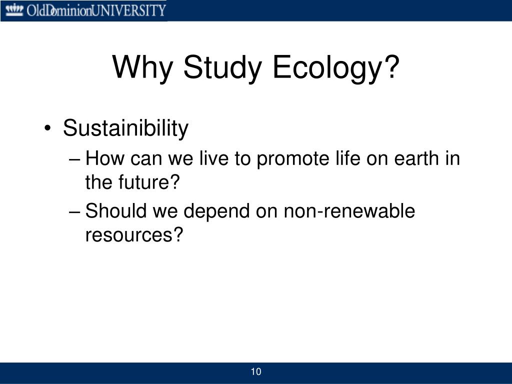Why Study Ecology? • Sustainibility • How can we live to promote life on earth in the future? • Should we depend on non-renewable resources?