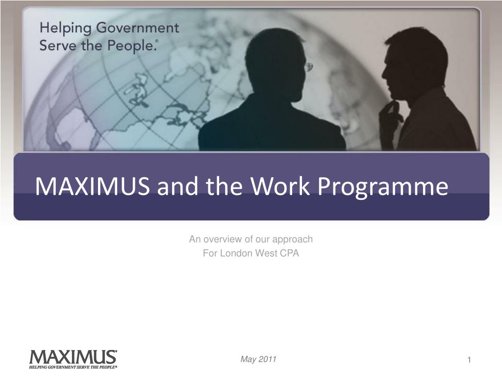 MAXIMUS and the Work Programme. An overview of our approach For London West CPA. Introducing MAXIMUS. At a glance… MAXIMUS are a leading international welfare to work provider, with 290 offices and 7,000 employees in 5 countries. We support over 300,000 customers each year.