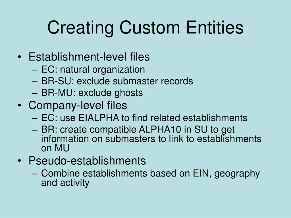 Creating Custom Entities • Establishment-level files • EC: natural organization • BR-SU: exclude submaster records • BR-MU: exclude ghosts • Company-level files • EC: use EIALPHA to find related establishments • BR: create compatible ALPHA10 in SU to get information on submasters to link to establishments on MU • Pseudo-establishments • Combine establishments based on EIN, geography and activity