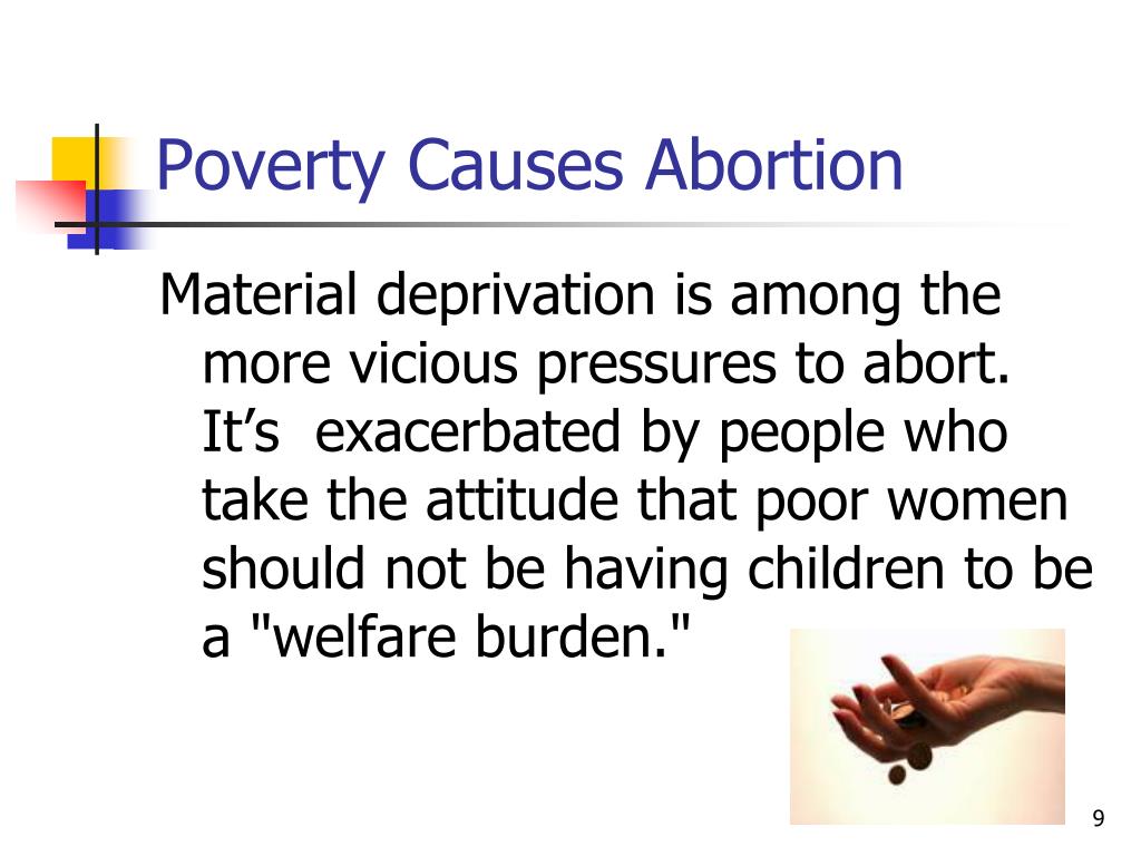 Poverty Causes Abortion Material deprivation is among the more vicious pressures to abort. It’s exacerbated by people who take the attitude that poor women should not be having children to be a "welfare burden."