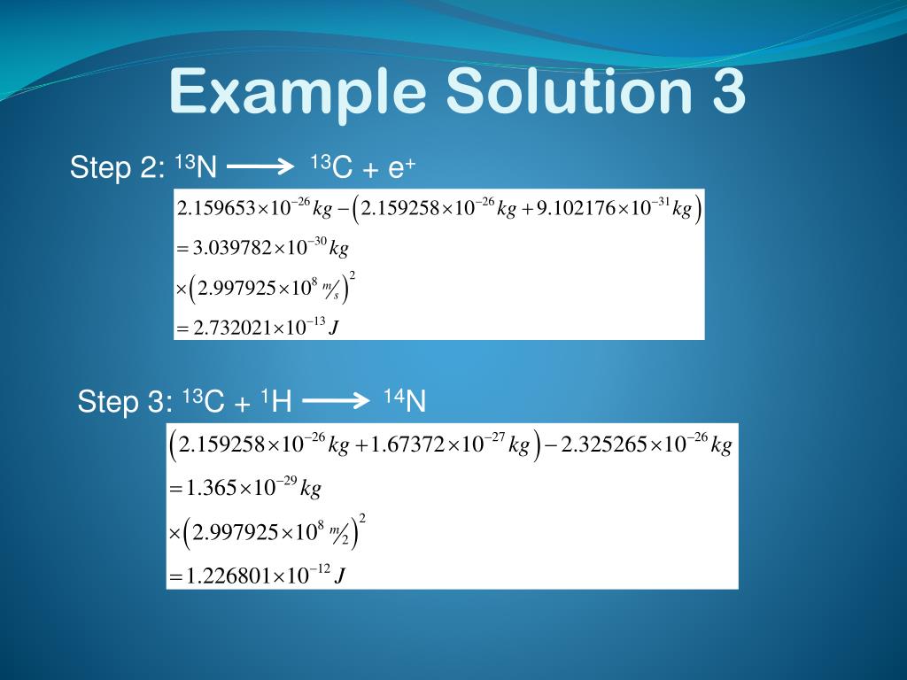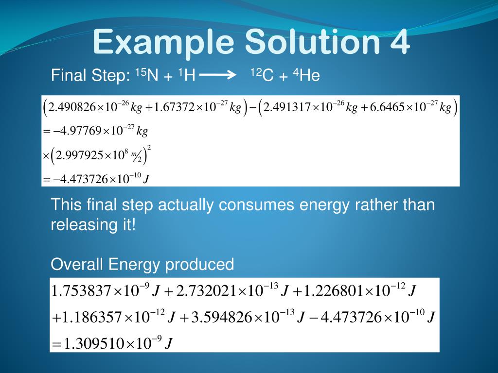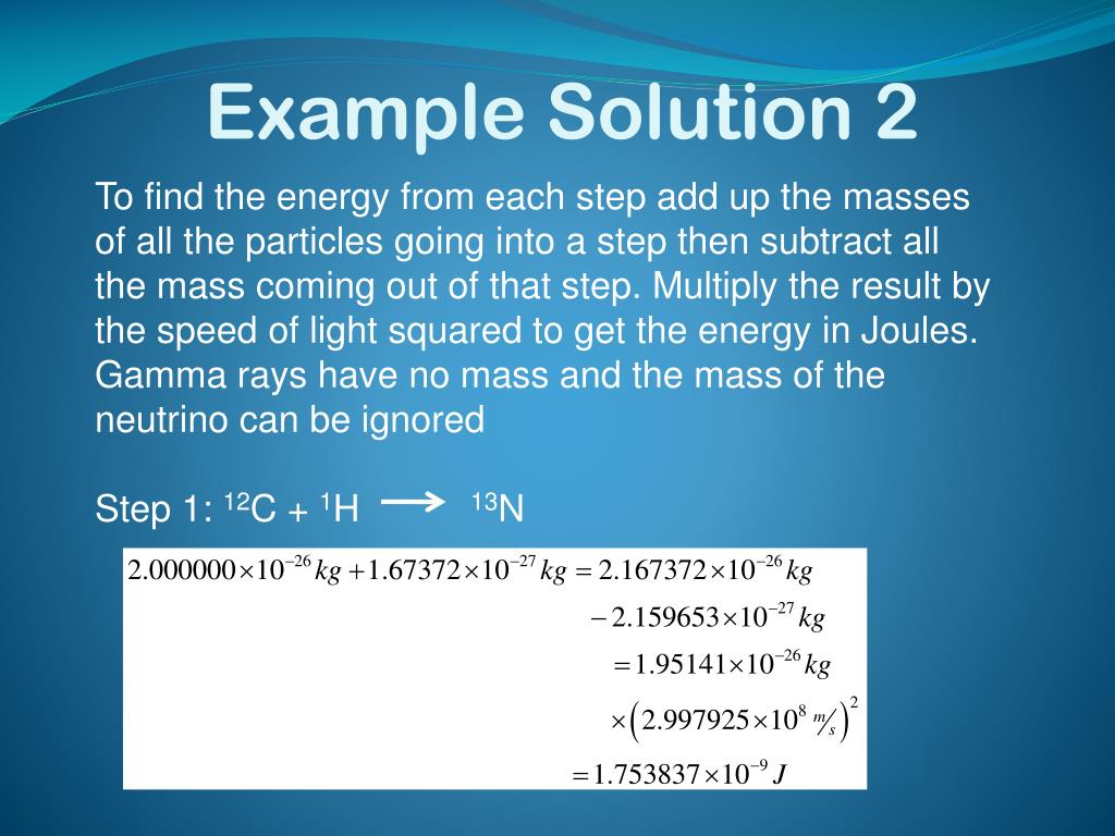 Example Solution 2 To find the energy from each step add up the masses of all the particles going into a step then subtract all the mass coming out of that step. Multiply the result by the speed of light squared to get the energy in Joules. Gamma rays have no mass and the mass of the neutrino can be ignored Step 1: 12C + 1H 13N