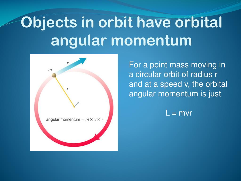 Objects in orbit have orbital angular momentum For a point mass moving in a circular orbit of radius r and at a speed v, the orbital angular momentum is just L = mvr