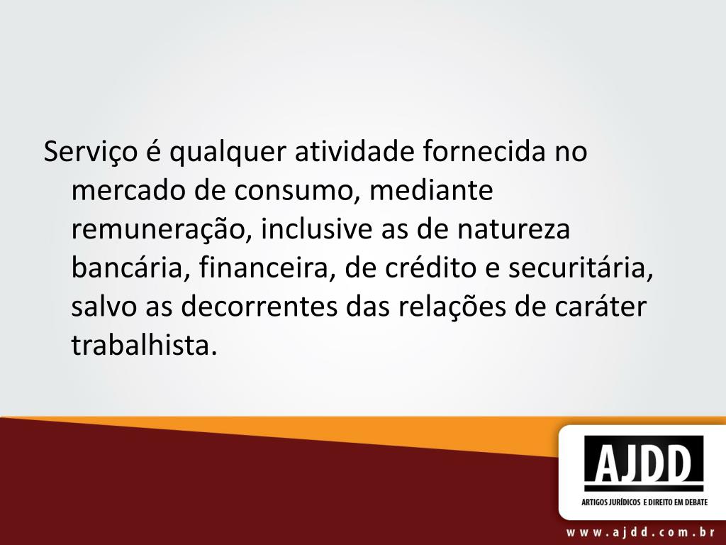 Serviço é qualquer atividade fornecida no mercado de consumo, mediante remuneração, inclusive as de natureza bancária, financeira, de crédito e securitária, salvo as decorrentes das relações de caráter trabalhista.