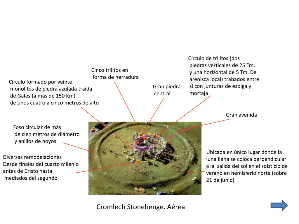 Círculo de trilitos (dos piedras verticales de 25 Tm. y una horizontal de 5 Tm. De arenisca local) trabados entre sí con junturas de espiga y mortaja Cinco trilitos en forma de herradura Círculo formado por veinte monolitos de piedra azulada traída de Gales (a más de 150 Km) de unos cuatro a cinco metros de alto Gran piedra central Gran avenida Foso circular de más de cien metros de diámetro y anillos de hoyos Ubicada en único lugar donde la luna llena se coloca perpendicular a la salida del sol en el solsticio de verano en hemisferio norte (sobre 21 de junio) Diversas remodelaciones Desde finales del cuarto milenio antes de Cristo hasta mediados del segundo Cromlech Stonehenge. Aérea