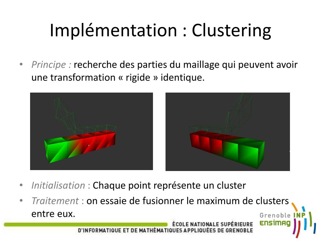 Implémentation : Clustering • Principe : recherche des parties du maillage qui peuvent avoir une transformation « rigide » identique. • Initialisation : Chaque point représente un cluster • Traitement : on essaie de fusionner le maximum de clusters entre eux.