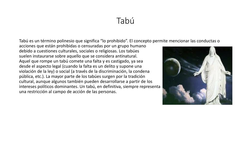 Tabú Tabú es un término polinesio que significa “lo prohibido”. El concepto permite mencionar las conductas o acciones que están prohibidas o censuradas por un grupo humano debido a cuestiones culturales, sociales o religiosas. Los tabúes suelen instaurarse sobre aquello que se considera antinatural. Aquel que rompe un tabú comete una falta y es castigado, ya sea desde el aspecto legal (cuando la falta es un delito y supone una violación de la ley) o social (a través de la discriminación, la condena pública, etc.). La mayor parte de los tabúes surgen por la tradición cultural, aunque algunos también pueden desarrollarse a partir de los intereses políticos dominantes. Un tabú, en definitiva, siempre representa una restricción al campo de acción de las personas.