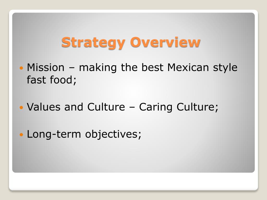 Mission – making the best Mexican style fast food; • Values and Culture – Caring Culture; • Long-term objectives; Strategy Overview