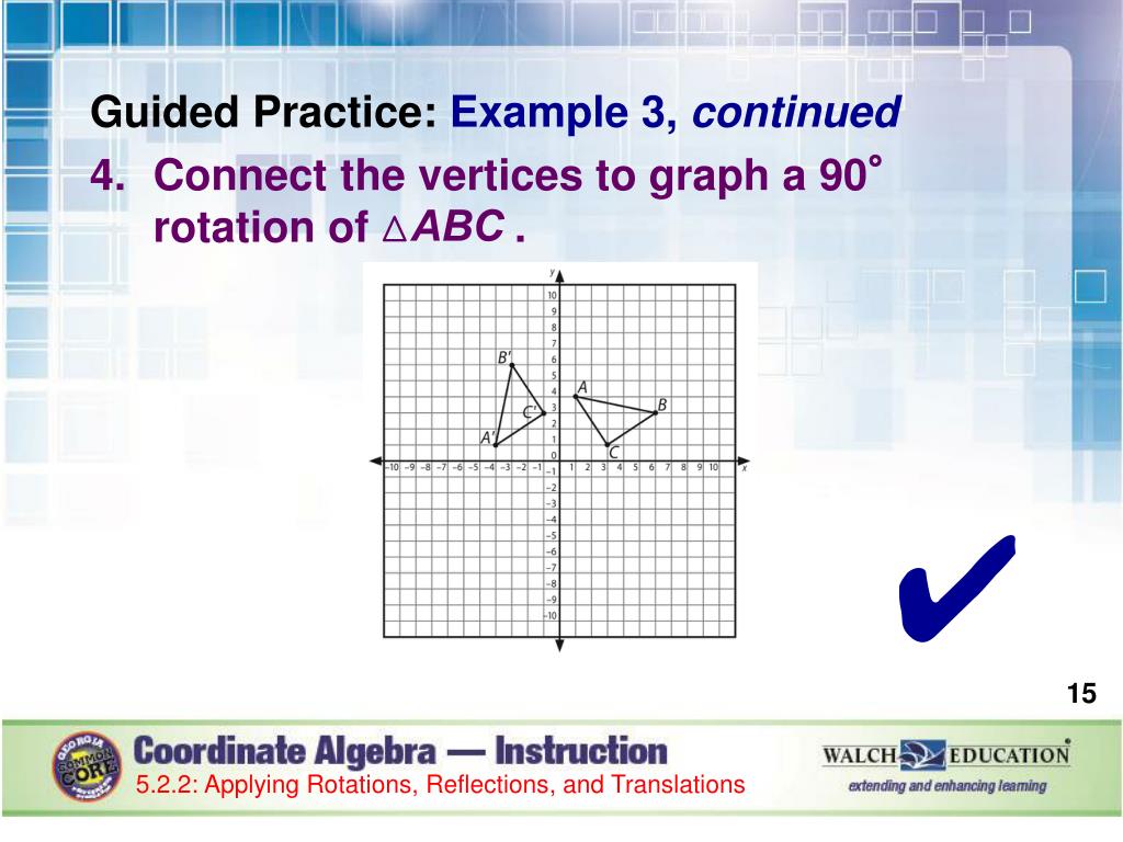 Guided Practice: Example 3, continued Connect the vertices to graph a 90° rotation of . ✔ 5.2.2: Applying Rotations, Reflections, and Translations
