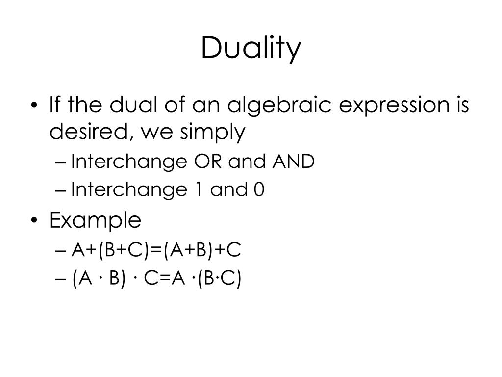 Duality • If the dual of an algebraic expression is desired, we simply • Interchange OR and AND • Interchange 1 and 0 • Example • A+(B+C)=(A+B)+C • (A ∙ B) ∙ C=A ∙(B∙C)