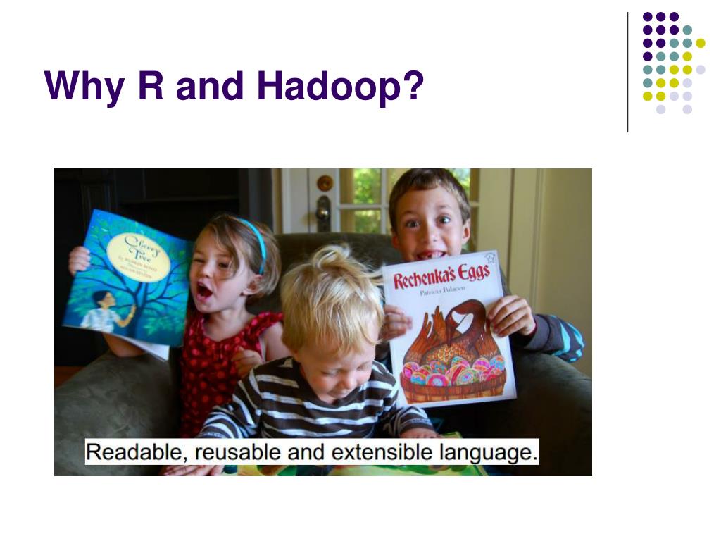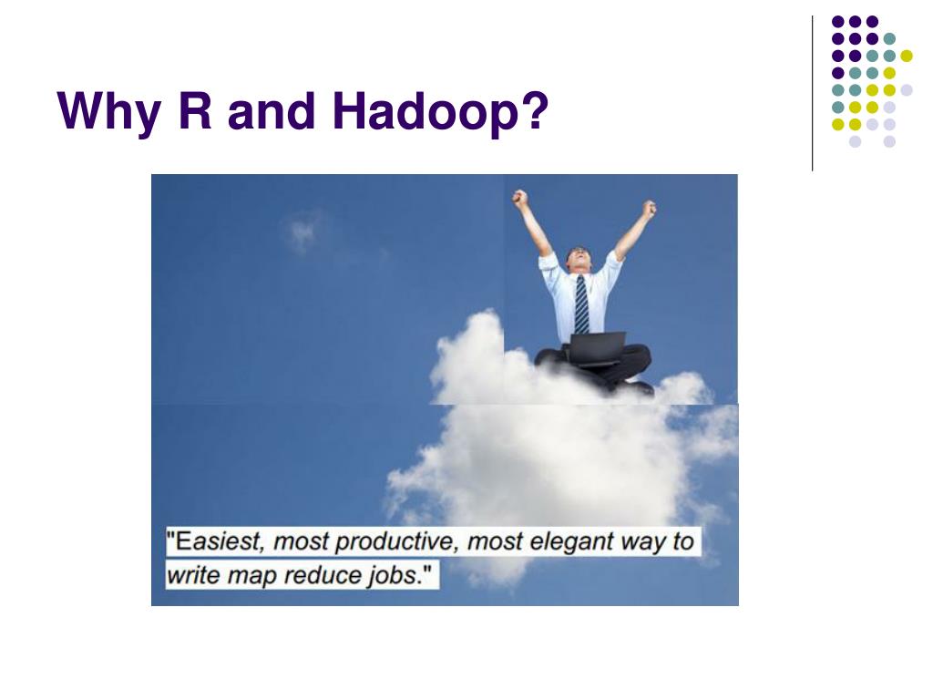Rhadoop用途 The open-source RHadoop project makes it easier to extract data from Hadoop for analysis with R, and to run R within the nodes of the Hadoop cluster -- essentially, to transform Hadoop into a massively-parallel statistical computing cluster based on R.