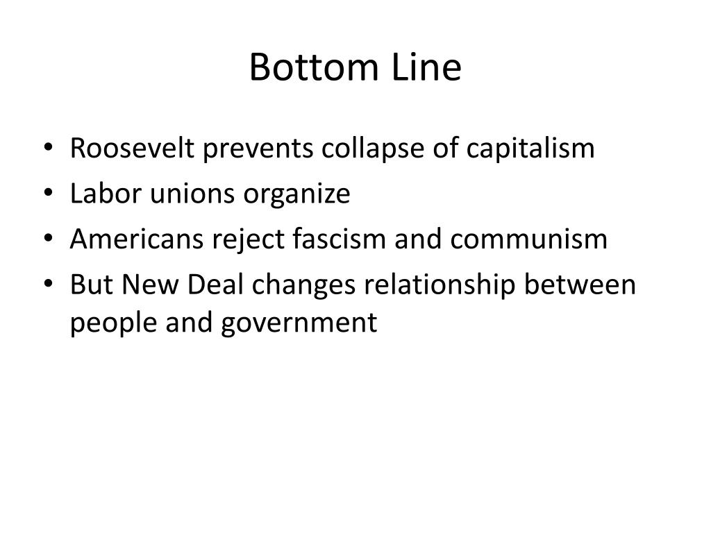 Bottom Line • Roosevelt prevents collapse of capitalism • Labor unions organize • Americans reject fascism and communism • But New Deal changes relationship between people and government