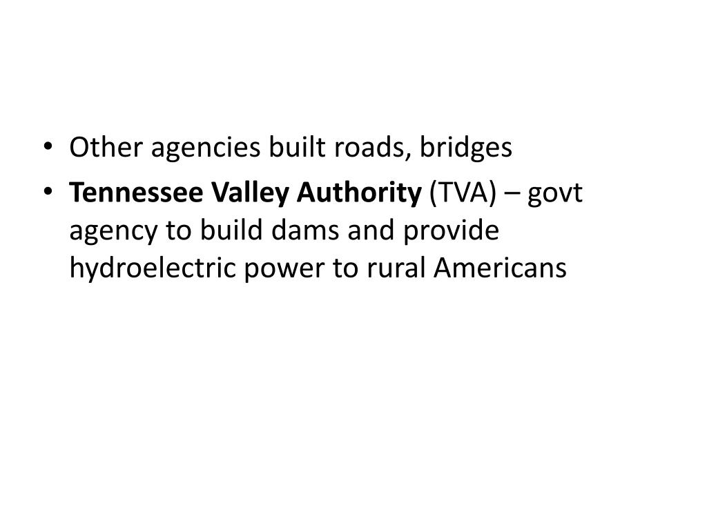 Other agencies built roads, bridges • Tennessee Valley Authority (TVA) – govt agency to build dams and provide hydroelectric power to rural Americans