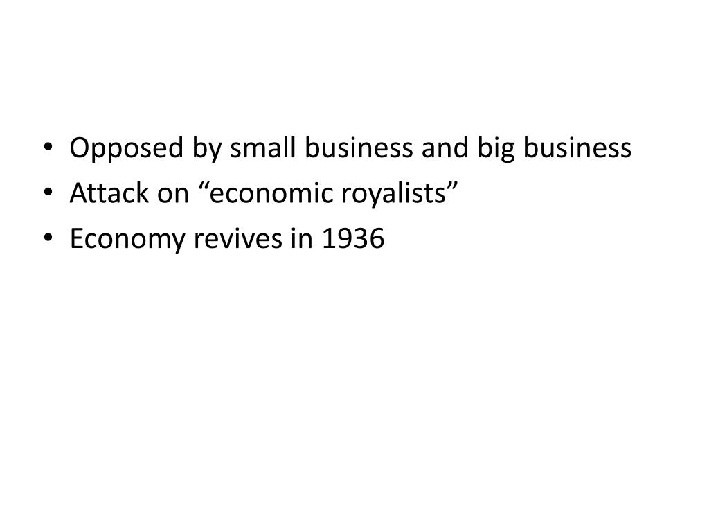 Opposed by small business and big business • Attack on “economic royalists” • Economy revives in 1936