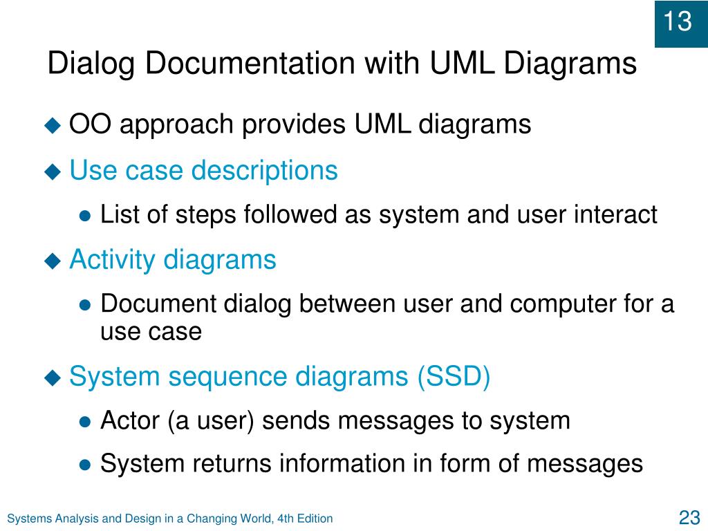 Dialog Documentation with UML Diagrams • OO approach provides UML diagrams • Use case descriptions • List of steps followed as system and user interact • Activity diagrams • Document dialog between user and computer for a use case • System sequence diagrams (SSD) • Actor (a user) sends messages to system • System returns information in form of messages Systems Analysis and Design in a Changing World, 4th Edition