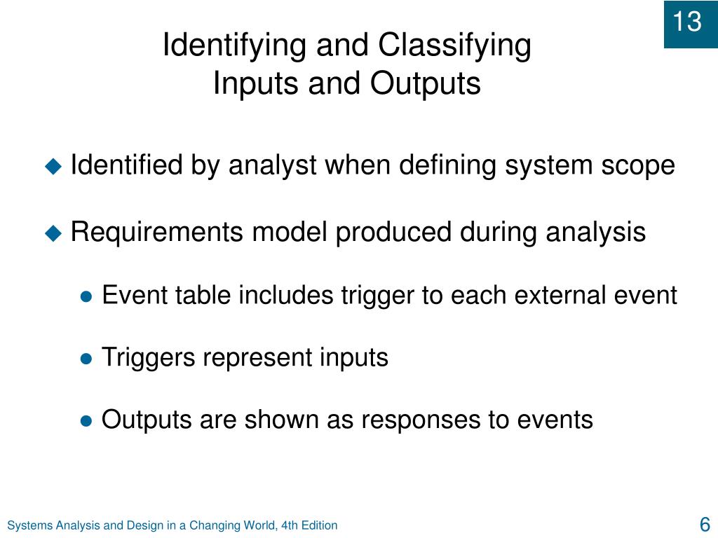 Identifying and Classifying Inputs and Outputs • Identified by analyst when defining system scope • Requirements model produced during analysis • Event table includes trigger to each external event • Triggers represent inputs • Outputs are shown as responses to events Systems Analysis and Design in a Changing World, 4th Edition