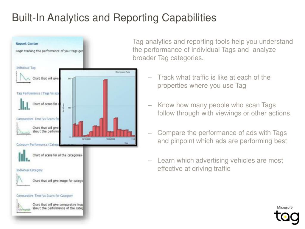 Tag analytics and reporting tools help you understand the performance of individual Tags and analyze broader Tag categories. • Track what traffic is like at each of the properties where you use Tag • Know how many people who scan Tags follow through with viewings or other actions. • Compare the performance of ads with Tags and pinpoint which ads are performing best • Learn which advertising vehicles are most effective at driving traffic Built-In Analytics and Reporting Capabilities