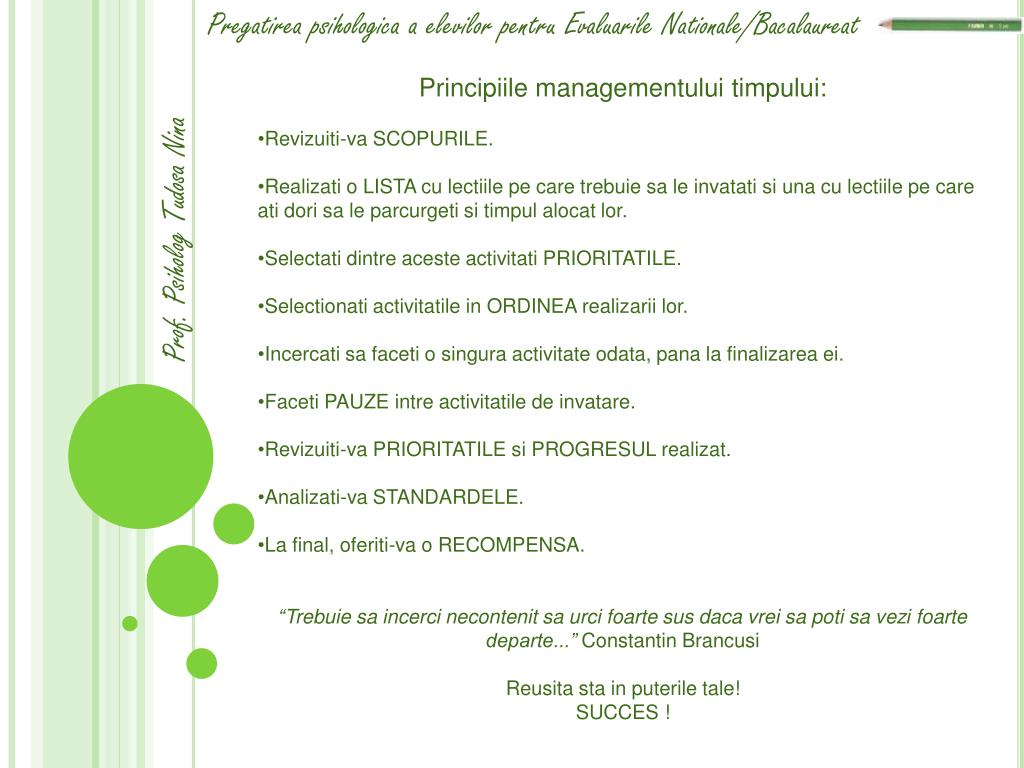 Pregatireapsihologica a elevilorpentruEvaluarileNationale/Bacalaureat Prof. PsihologTudosa Nina Principiile managementului timpului: • Revizuiti-va SCOPURILE. • Realizati o LISTA cu lectiilepe care trebuiesa le invatatisiuna cu lectiilepe care atidorisa le parcurgetisitimpulalocatlor. • Selectatidintreacesteactivitati PRIORITATILE. • Selectionatiactivitatile in ORDINEA realizariilor. • Incercatisafaceti o singuraactivitateodata, pana la finalizareaei. • Faceti PAUZE intreactivitatile de invatare. • Revizuiti-va PRIORITATILE si PROGRESUL realizat. • Analizati-va STANDARDELE. • La final, oferiti-va o RECOMPENSA. • “Trebuie sa incerci necontenit sa urci foarte sus daca vrei sa poti sa vezi foarte departe...”Constantin BrancusiReusita sta in puterile tale!SUCCES !
