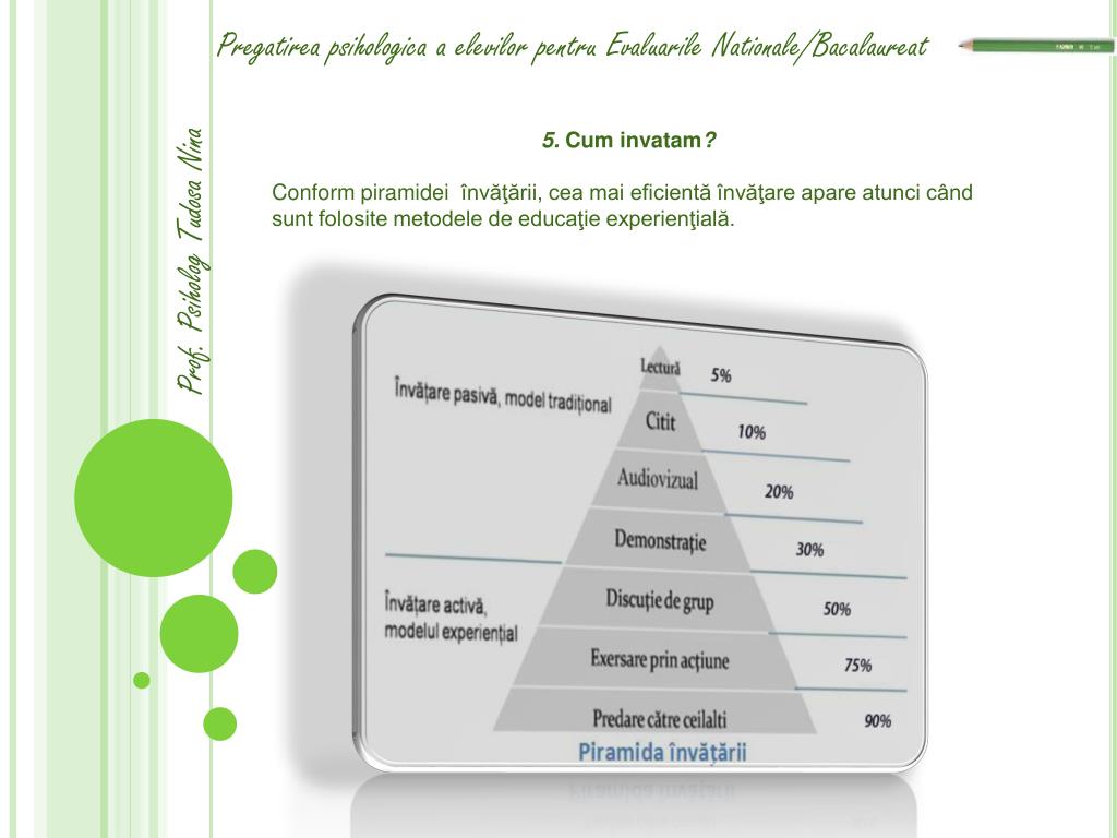 Pregatireapsihologica a elevilorpentruEvaluarileNationale/Bacalaureat Prof. PsihologTudosa Nina 5. Cuminvatam? Conform piramidei învăţării, cea mai eficientă învăţare apare atunci când sunt folosite metodele de educaţie experienţială.