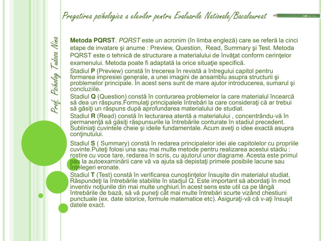 Prof. PsihologTudosa Nina Pregatireapsihologica a elevilorpentruEvaluarileNationale/Bacalaureat • MetodaPQRST. PQRSTeste un acronim (în limba engleză) care se referă la cinci etape de invatare şi anume : Preview, Question, Read, Summary şi Test. Metoda PQRST este o tehnică de structurare a materialului de învăţat conform cerinţelor examenului. Metoda poate fi adaptată la orice situaţie specifică. Stadiul P (Preview) constă în trecerea în revistă a întregului capitol pentru formarea impresiei generale, a unei imagini de ansamblu asupra structurii şi problemelor principale. În acest sens sunt de mare ajutor introducerea, sumarul şi concluziile. Stadiul Q (Question) constă în conturarea problemelor la care materialul încearcă să dea un răspuns.Formulaţi principalele întrebări la care consideraţi că ar trebui să găsiţi un răspuns după aprofundarea materialului de studiat. Stadiul R (Read) constă în lecturarea atentă a materialului , concentrându-vă în permanenţă să găsiţi răspunsurile la întrebările conturate în stadiul precedent. Subliniaţi cuvintele cheie şi ideile fundamentale. Acum aveţi o idee exactă asupra conţinutului. Stadiul S ( Summary) constă în redarea principalelor idei ale capitolelor cu propriile cuvinte.Puteţi folosi una sau mai multe metode pentru realizarea acestui stadiu : rostire cu voce tare, redarea în scris, cu ajutorul unor diagrame. Acesta este primul pas la autoexaminării care vă va ajuta să depistaţi primele posibile lacune sau înţelegeri eronate. Stadiul T (Test) constă în verificarea cunoştinţelor însuşite din materialul studiat. Răspundeţi la întrebările stabilite în stadiul Q. Este important să abordaţi în mod inventiv noţiunile din mai multe unghiuri.În acest sens este util ca pe lângă întrebările de bază, să vă puneţi cât mai multe întrebări scurte vizând chestiuni punctuale (ex. date istorice, formule matematice etc). Asiguraţi-vă că v-aţi însuşit datele exact.