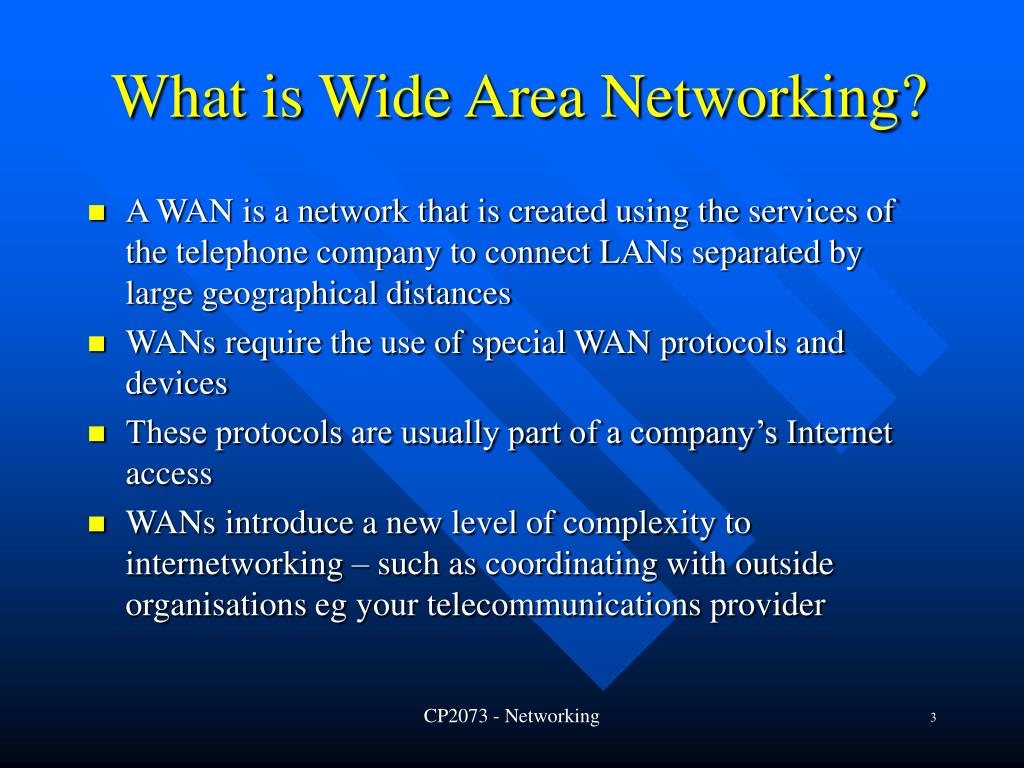 What is Wide Area Networking? • A WAN is a network that is created using the services of the telephone company to connect LANs separated by large geographical distances • WANs require the use of special WAN protocols and devices • These protocols are usually part of a company’s Internet access • WANs introduce a new level of complexity to internetworking – such as coordinating with outside organisations eg your telecommunications provider CP2073 - Networking