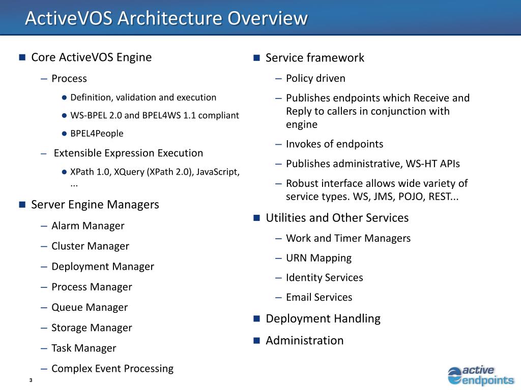ActiveVOS Architecture Overview • Core ActiveVOSEngine • Process • Definition, validation and execution • WS-BPEL 2.0 and BPEL4WS 1.1 compliant • BPEL4People • Extensible Expression Execution • XPath 1.0, XQuery (XPath 2.0), JavaScript, ... • Server Engine Managers • Alarm Manager • Cluster Manager • Deployment Manager • Process Manager • Queue Manager • Storage Manager • Task Manager • Complex Event Processing • Service framework • Policy driven • Publishes endpoints which Receive and Reply to callers in conjunction with engine • Invokes of endpoints • Publishes administrative, WS-HT APIs • Robust interface allows wide variety of service types. WS, JMS, POJO, REST... • Utilities and Other Services • Work and Timer Managers • URN Mapping • Identity Services • Email Services • Deployment Handling • Administration
