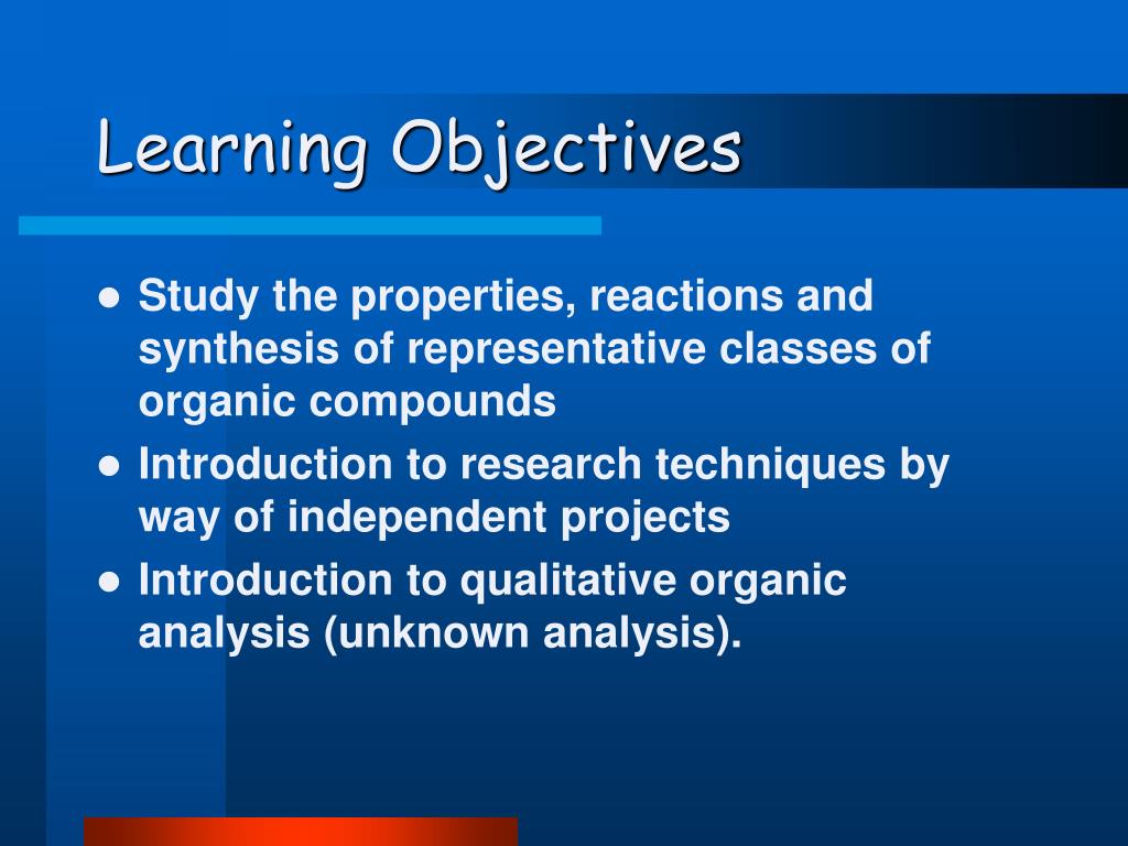 Learning Objectives • Study the properties, reactions and synthesis of representative classes of organic compounds • Introduction to research techniques by way of independent projects • Introduction to qualitative organic analysis (unknown analysis).