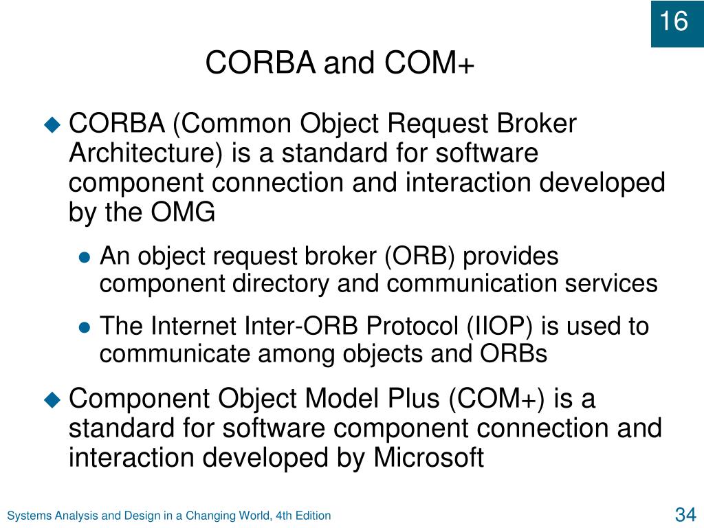 CORBA and COM+ • CORBA (Common Object Request Broker Architecture) is a standard for software component connection and interaction developed by the OMG • An object request broker (ORB) provides component directory and communication services • The Internet Inter-ORB Protocol (IIOP) is used to communicate among objects and ORBs • Component Object Model Plus (COM+) is a standard for software component connection and interaction developed by Microsoft Systems Analysis and Design in a Changing World, 4th Edition