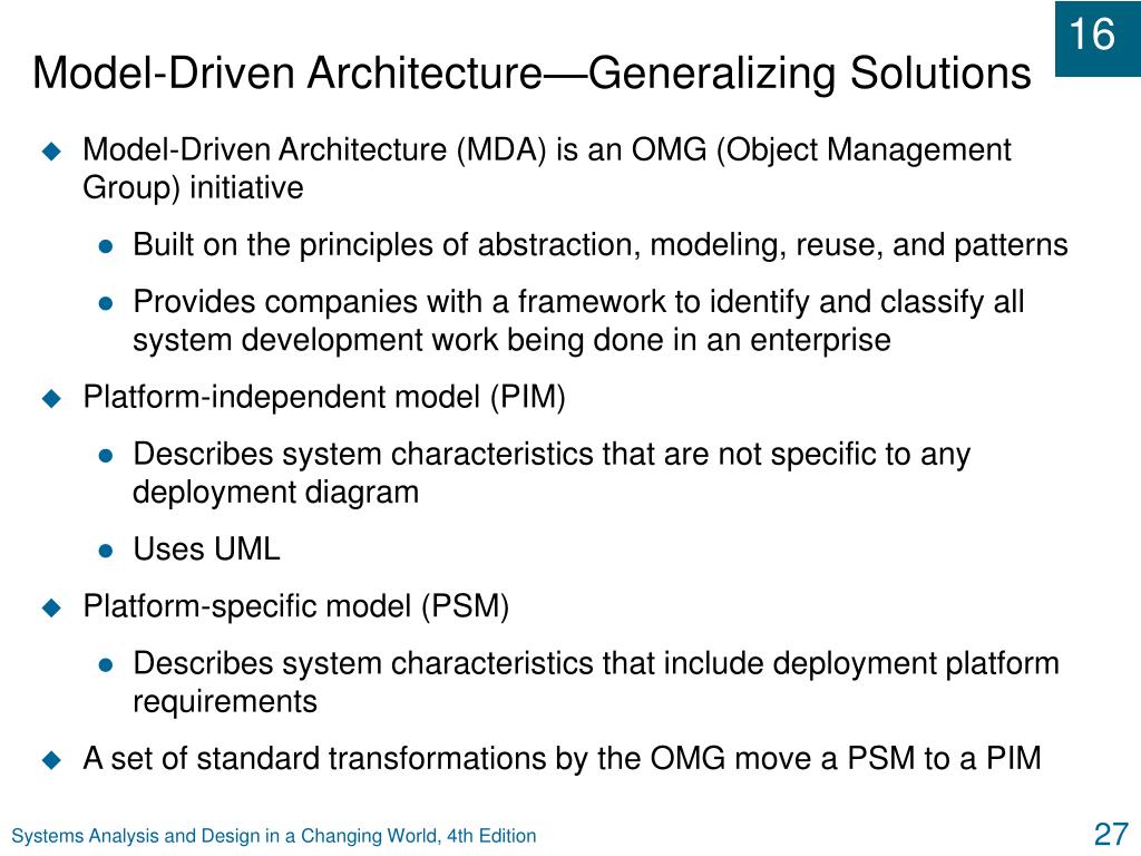 Model-Driven Architecture—Generalizing Solutions • Model-Driven Architecture (MDA) is an OMG (Object Management Group) initiative • Built on the principles of abstraction, modeling, reuse, and patterns • Provides companies with a framework to identify and classify all system development work being done in an enterprise • Platform-independent model (PIM) • Describes system characteristics that are not specific to any deployment diagram • Uses UML • Platform-specific model (PSM) • Describes system characteristics that include deployment platform requirements • A set of standard transformations by the OMG move a PSM to a PIM Systems Analysis and Design in a Changing World, 4th Edition
