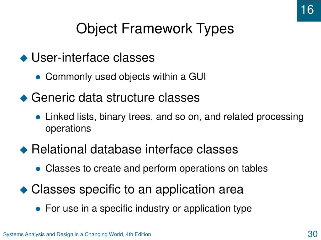 Object Framework Types • User-interface classes • Commonly used objects within a GUI • Generic data structure classes • Linked lists, binary trees, and so on, and related processing operations • Relational database interface classes • Classes to create and perform operations on tables • Classes specific to an application area • For use in a specific industry or application type Systems Analysis and Design in a Changing World, 4th Edition
