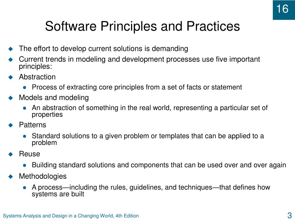 Software Principles and Practices • The effort to develop current solutions is demanding • Current trends in modeling and development processes use five important principles: • Abstraction • Process of extracting core principles from a set of facts or statement • Models and modeling • An abstraction of something in the real world, representing a particular set of properties • Patterns • Standard solutions to a given problem or templates that can be applied to a problem • Reuse • Building standard solutions and components that can be used over and over again • Methodologies • A process—including the rules, guidelines, and techniques—that defines how systems are built Systems Analysis and Design in a Changing World, 4th Edition